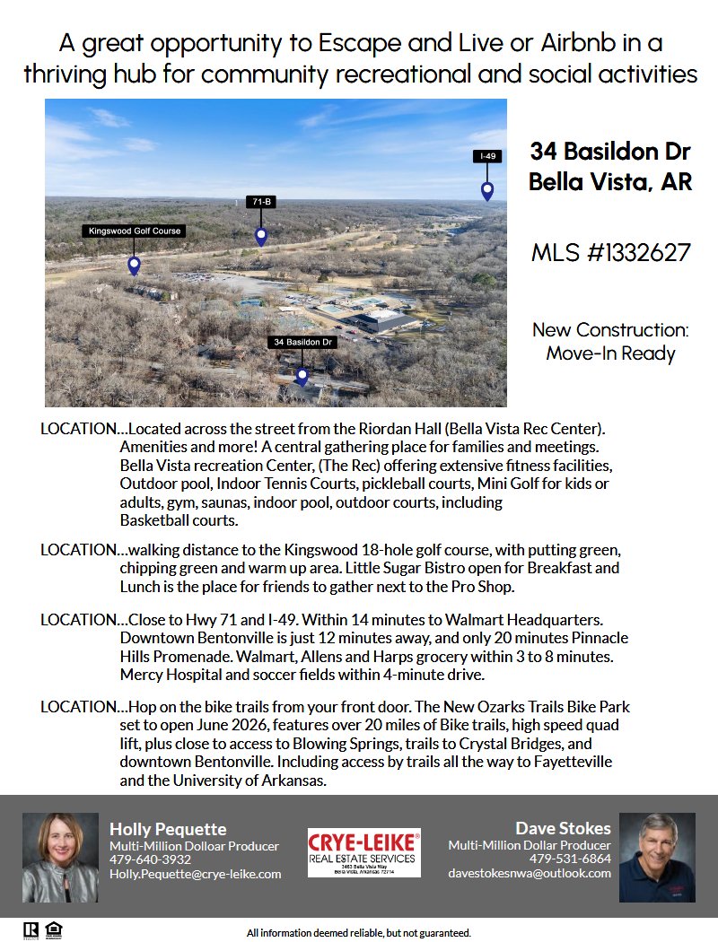 - LOCATION…Hop on the bike trails from your front door. The New Ozarks Trails Bike Park set to open June 2026, features over 20 miles of Bike trails, high speed quad lift, plus close to access to Blowing Springs, trails to Crystal Bridges, and downtown Bentonville. Including access by trails all the way to Fayetteville and the University of Arkansas.